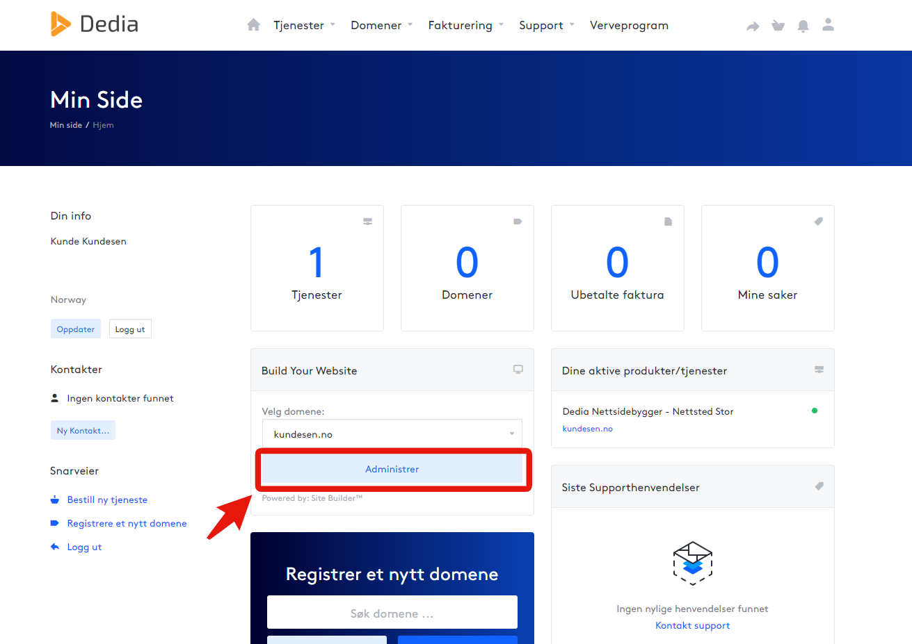 For å komme i gang med nettsidebyggeren, logg inn på Min Side: dedia.no/minside