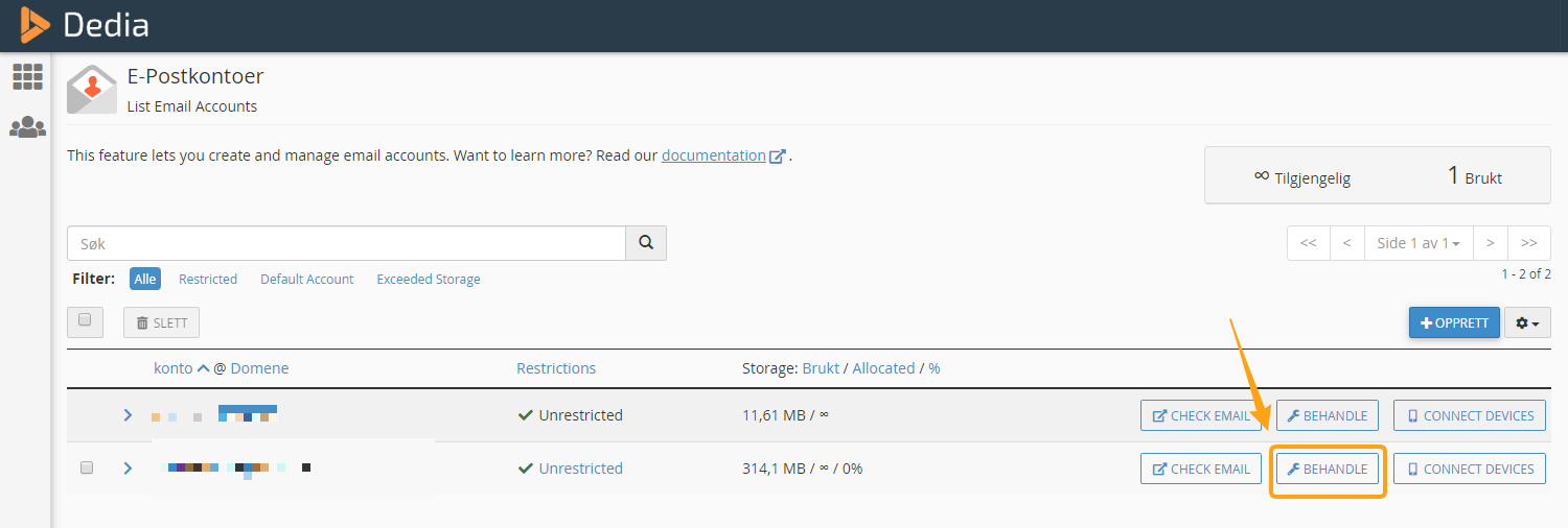 5) Klikk Behandle på e-postkontoen som skal ha nytt passord