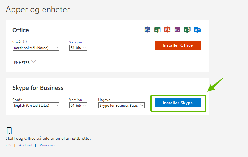 Dine brukere (ansatte i bedriften) logger direkte inn på office.com med sin e-postadresse og sitt passord for å få tilgang til sine ressurser. Slik kan du laste ned og installere nyeste Skype for Business på din PC/Mac: