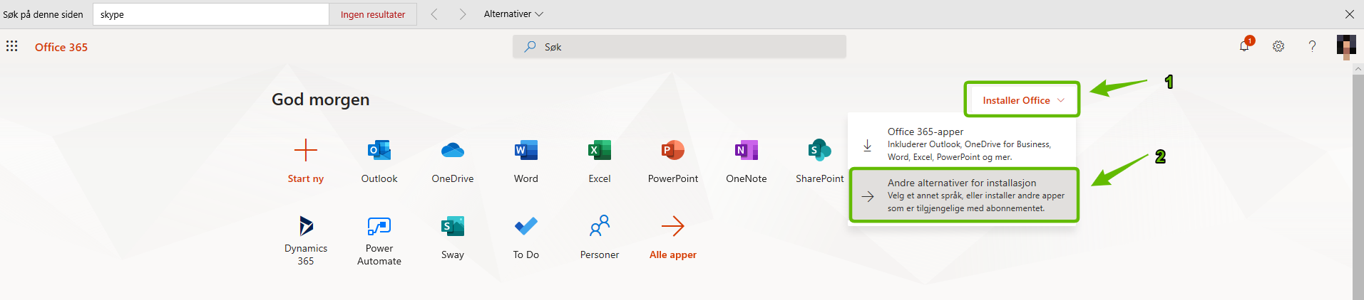 3) Klikk på knappen "Installer Office" og velg "Andre alternativer for installasjon".