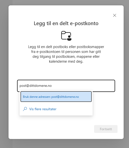 5) Skriv inn adressen til den delte mailboksen og fullfør tillegging