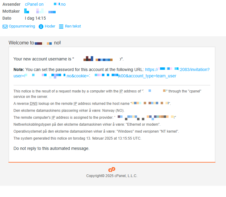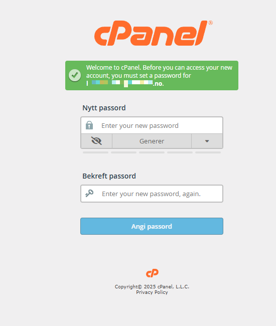 10) Når brukeren klikker på linken så vil han/hun kunne opprette et passord for sin cPanel-konto.