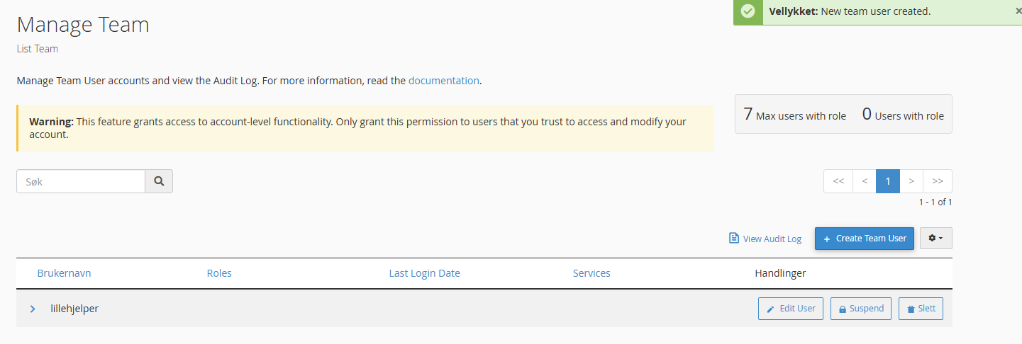 Brukeren er nå opprettet og klar til bruk! Dersom brukeren ikke får logget på, så bør du påse at hele brukernavnet angis. Altså brukernavn@dittdomene.no. Dersom brukeren ikke har tilgangene som er nødvendige, så kan du redigere brukerens roller og tilganger fra Manage Team-menyen.