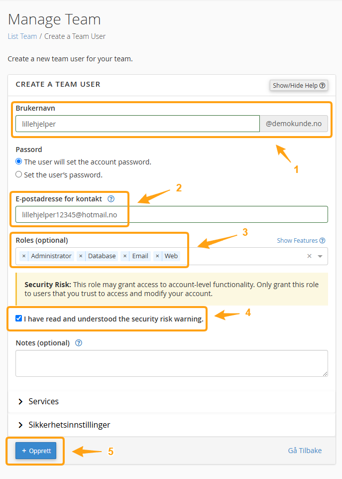 1. Angi brukernavn for pålogging cPanel (dette er kun for pålogging til cPanel - brukeren vil ikke få en epost-adresse på ditt domene). Vær klar over at brukeren må angi brukeravn@dittdomene.no ved pålogging cPanel. I eksempelbildet under vil altså brukeren måtte angi lillehjelper@demokunde.no ved pålogging cPanel.