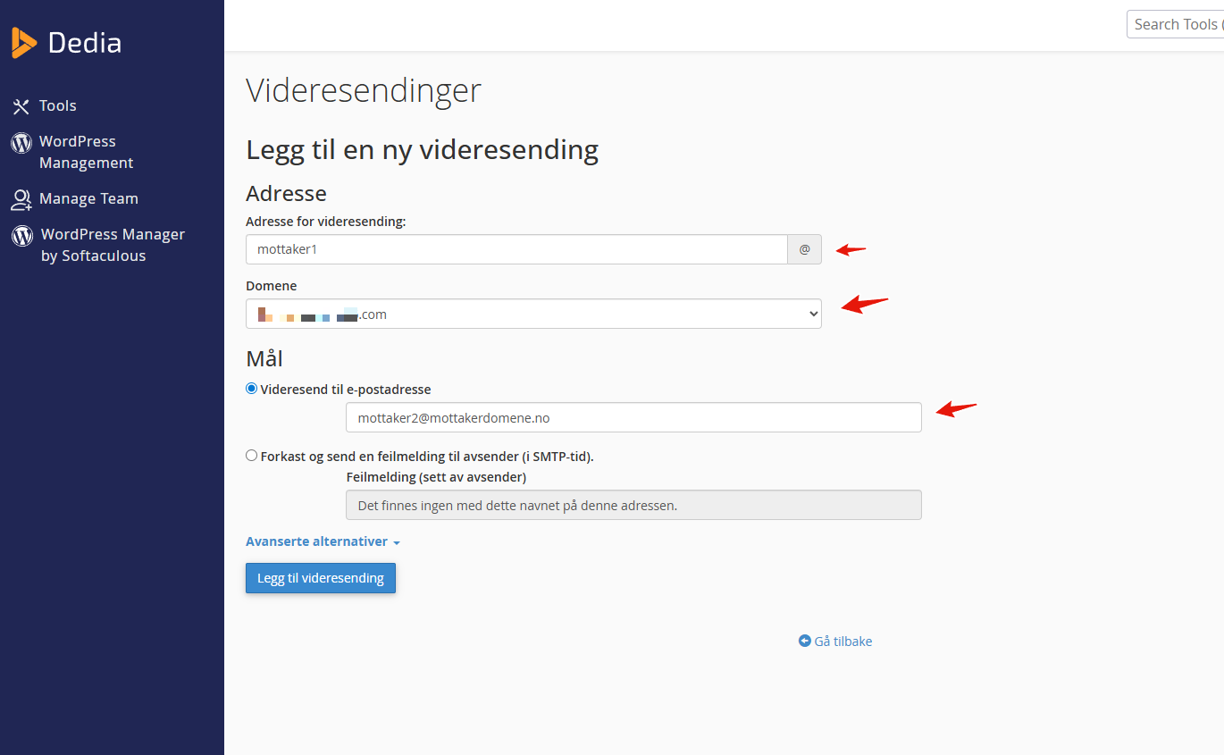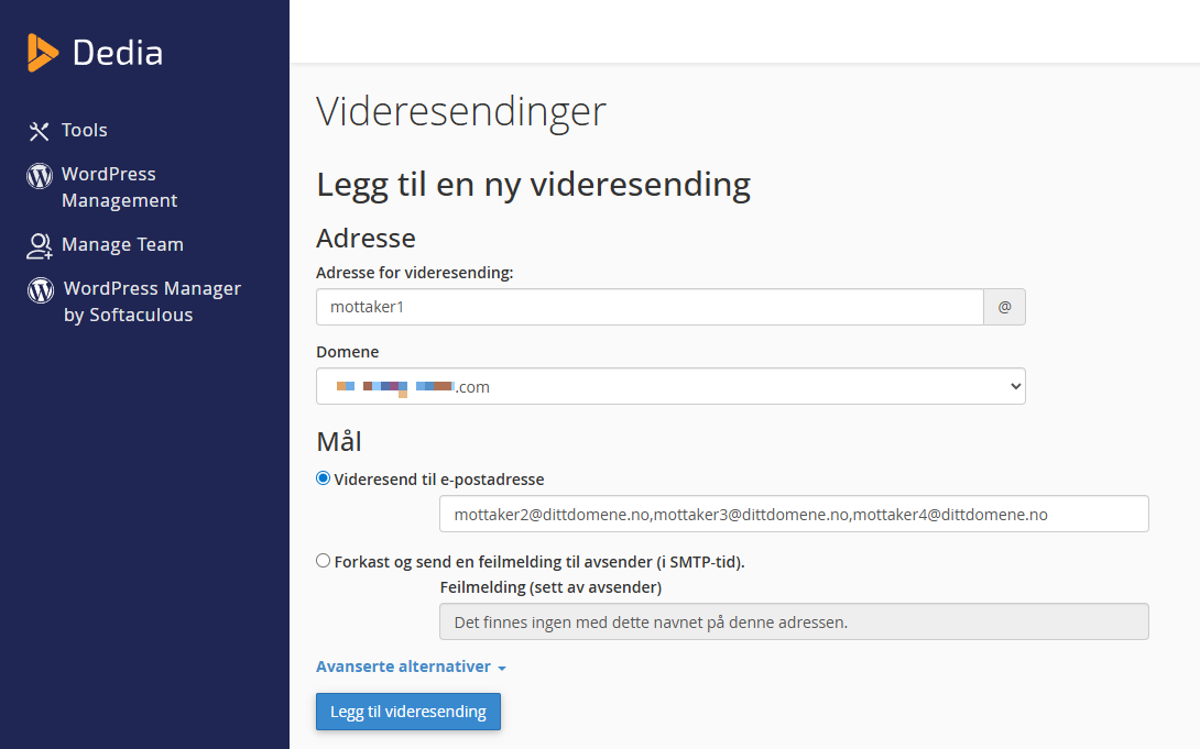 6) Hvis det skal videresendes til flere mottakere, så kan disse legges inn som en komma-separert liste. F.eks: mottaker2@dittdomene.no,mottaker3@dittdomene.no,mottaker4@dittdomene.no