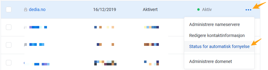 3) Klikk på de tre prikkene til høyre domenet det gjelder og velg "Status for Automatisk Fornyelse".